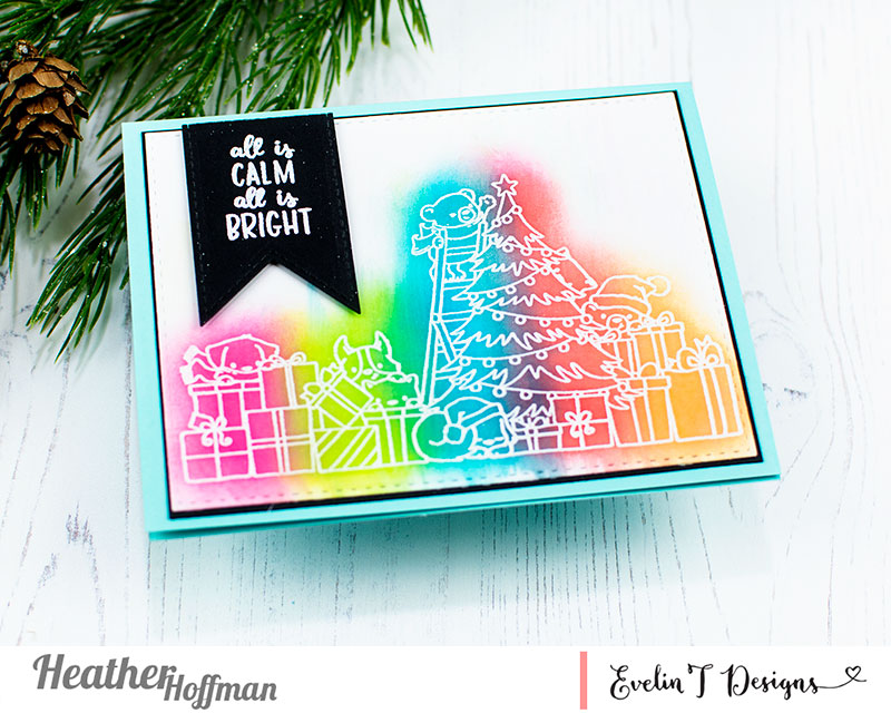 I had a fun time coloring this image with the no-line coloring technique. I stamped the image with a light colored ink (I used Papertrey Ink's Harvest Gold this time) and watercolored the image before adding colored pencils to create this effect. I also used a brown pen to dot the eyes and drew the little mouth on the bear hiding behind the tree and mountain of presents!